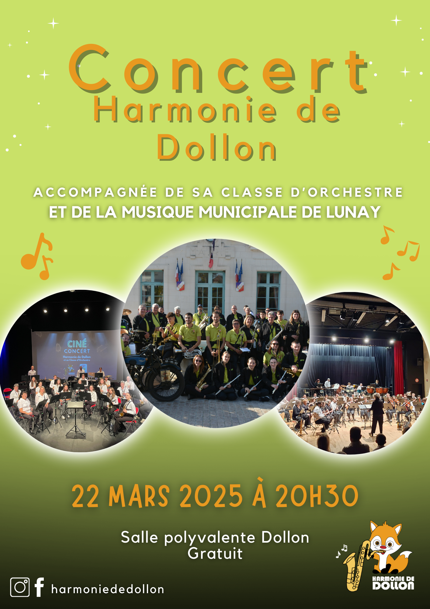 Samedi 22 mars, l’Harmonie de Dollon vous propose son concert annuel à 20h30 à la salle des fêtes du complexe Roland Pitard de Dollon.