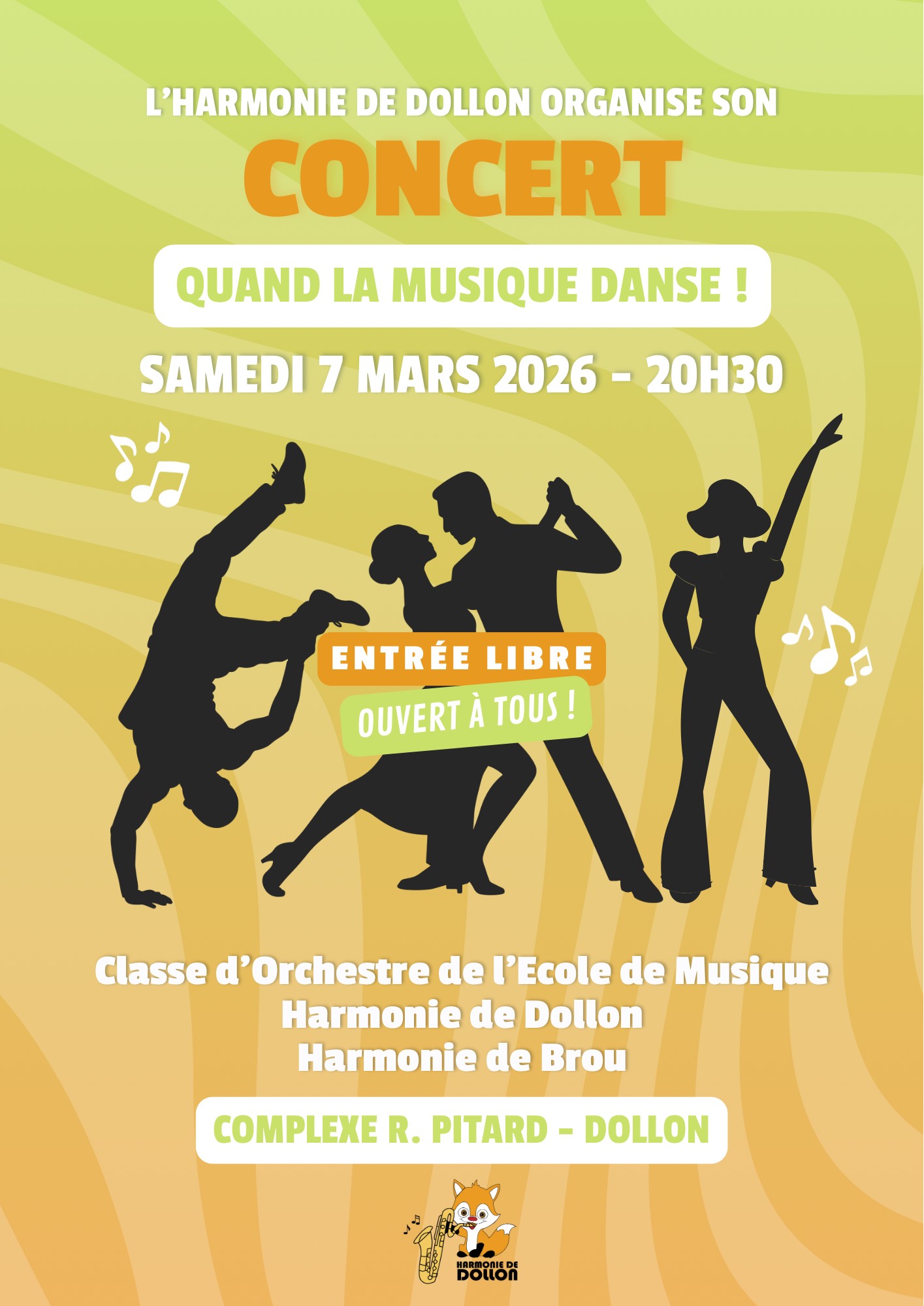 Samedi 7 mars, l’Harmonie de Dollon vous propose son concert annuel à 20h30 à la salle des fêtes du complexe Roland Pitard de Dollon, avec la participation de l'Harmonie de Brou.